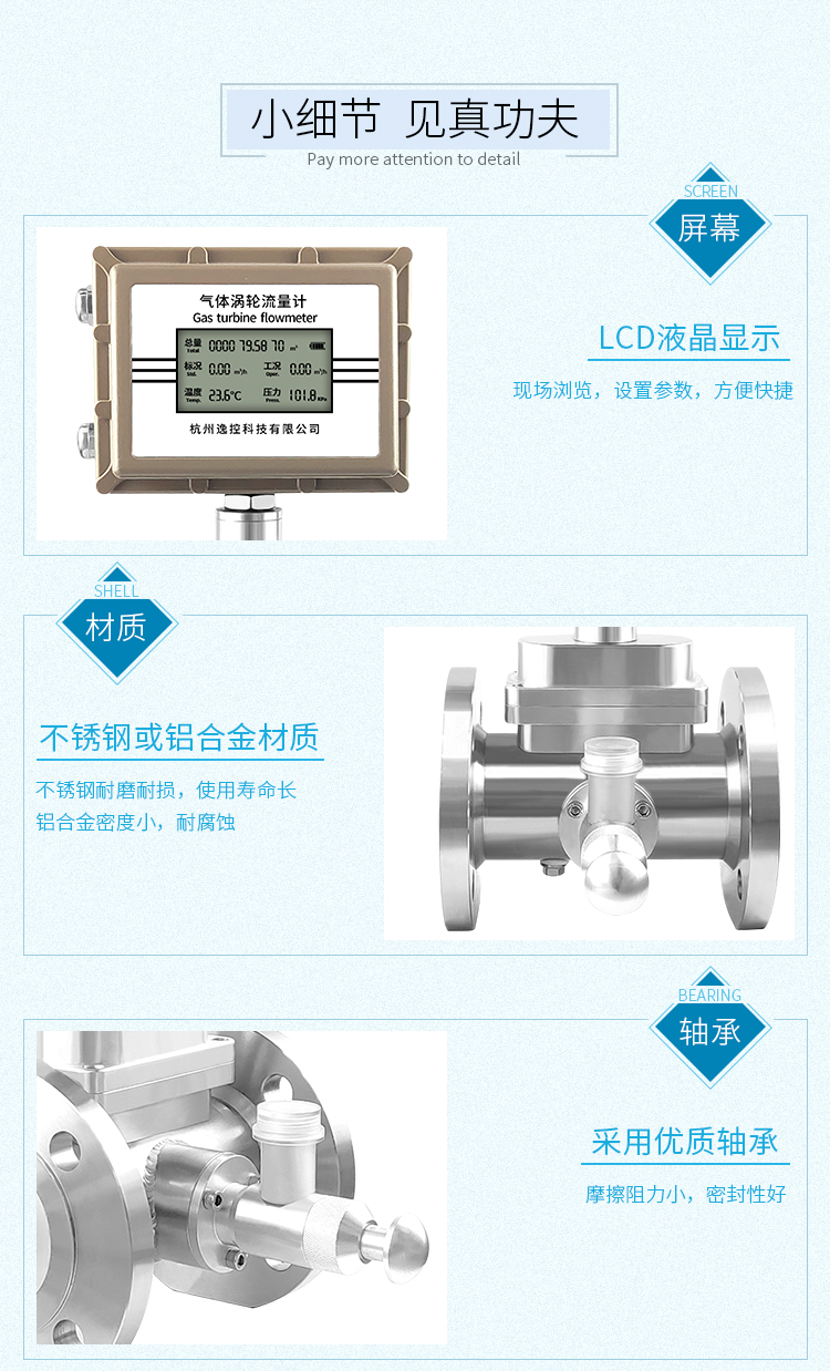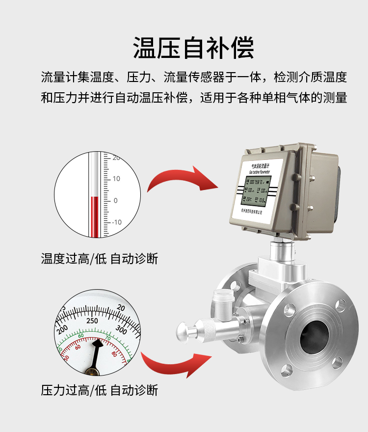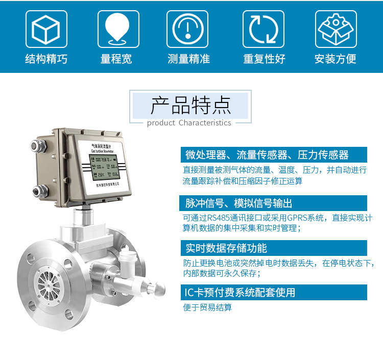 溫壓補償型氣體渦輪流量計集氣體渦輪流量傳感器與流量轉(zhuǎn)換器于一體,在流體的作用下,渦輪克服阻力矩和磨擦力矩開始轉(zhuǎn)動。當力矩達到平衡時,轉(zhuǎn)速穩(wěn)定,渦輪的轉(zhuǎn)速與氣體流量成正比, 并通過旋轉(zhuǎn)的發(fā)訊盤上的磁體周期性地改變磁場,從而使脈沖發(fā)生器輸出頻率與流速成正比的脈沖信號。