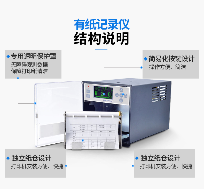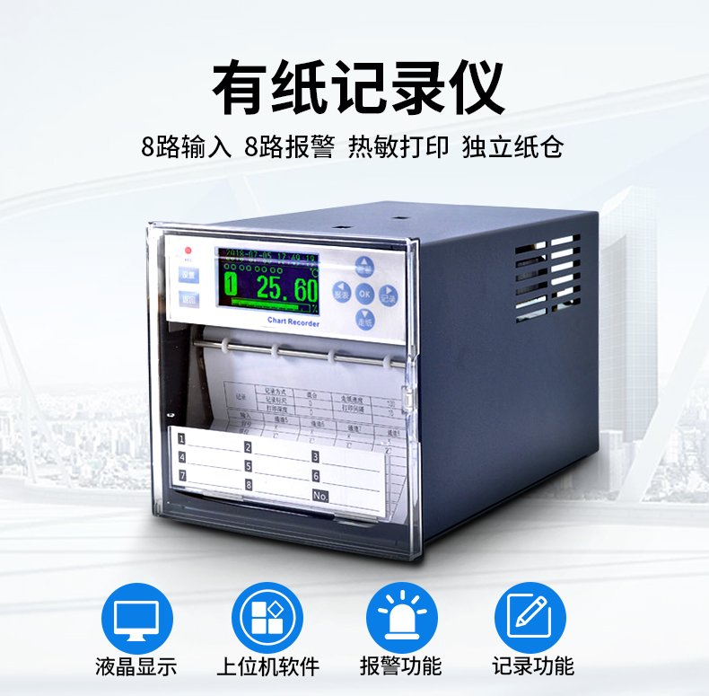 本有紙記錄儀是專業(yè)針對工業(yè)現(xiàn)場設(shè)計的多功能智能記錄儀。提供8路高精度模擬信號輸入通道,可配置8路報警,可提供傳感器配電,采用高精度熱敏打印機, 實現(xiàn)高精度數(shù)據(jù)、曲線和混合打?。痪哂懈咔逦鶲LED液晶顯示功能,提供實時數(shù)據(jù)單屏、多屏、棒圖等顯示, 提供報警狀態(tài)顯示;獨立的紙倉設(shè)計使打印紙安裝方便快捷。人性化的外觀設(shè)計、良好的硬件品質(zhì)、精湛的制造工藝, 具有性價比。