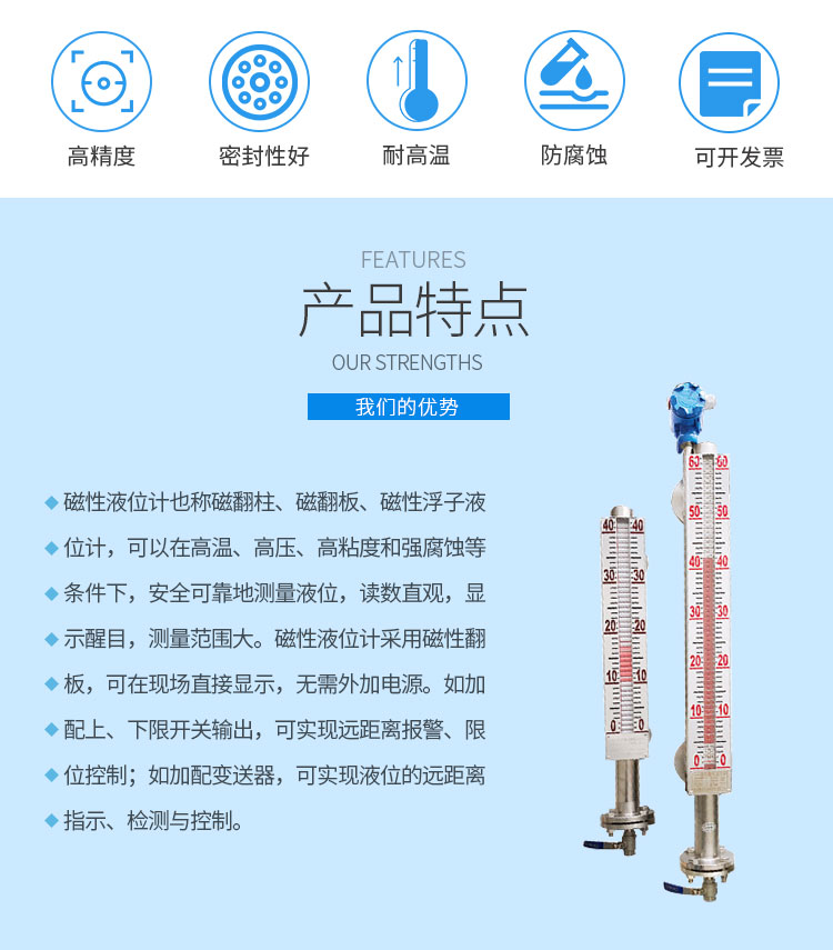 磁性液位計也稱磁翻柱、磁翻板、磁性浮子液位計,可以在高溫、高壓、高粘度和強腐蝕等條件下,安全可靠地測量液位,讀數(shù)直觀,顯示醒目,測量范圍大。該系列產(chǎn)品廣泛用于電力、石油、化工、冶金、環(huán)保、醫(yī)藥、食品等各行業(yè)過程中的液位測量和控制。 磁性液位計采用磁性翻板,可在現(xiàn)場直接顯示,無需外加電源。如加配上、下限開關(guān)輸出,可實現(xiàn)遠距離報警、限位控制;如加配變送器,可實現(xiàn)液位的遠距離指示、檢測與控制。