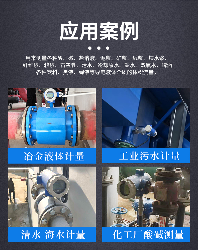 與渦街流量計的原理不同,電磁流量計是根據(jù)法拉第電磁感應(yīng)定律的一種流量測量儀表,用于測量管道中導(dǎo)電液體體積流量。由于電磁流量計的部件沒有轉(zhuǎn)動部分,也沒有阻礙流體流動的部件,因此幾乎沒有壓力損失;被測液體只與電磁流量計的管道襯里和電極相接觸,因此只要電極和襯里材料選擇合理,因此具有很好的耐腐蝕、耐磨損性能;安裝方便水平、垂直、傾斜均可安裝;測量精度高,可以達(dá)到0.5%;量程比大,一般為1:20。